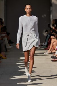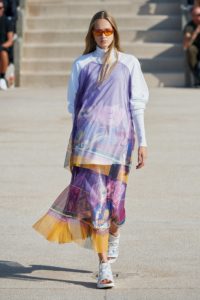 Jeremy Scott makes no distinction between high culture and low culture, and sees both as icons. This collection dedicated to Picasso and his muse. The first track appears as “Girl Before a Mirror “and continues as “Harlequin”and ” the Girl With a Mandolin” in its sequel. Scott says all the patterns backstage were hand-drawn and painted before going to digital print. Scott’s fashion shows come with a societal critique. It’s up to you to discover this one, too.